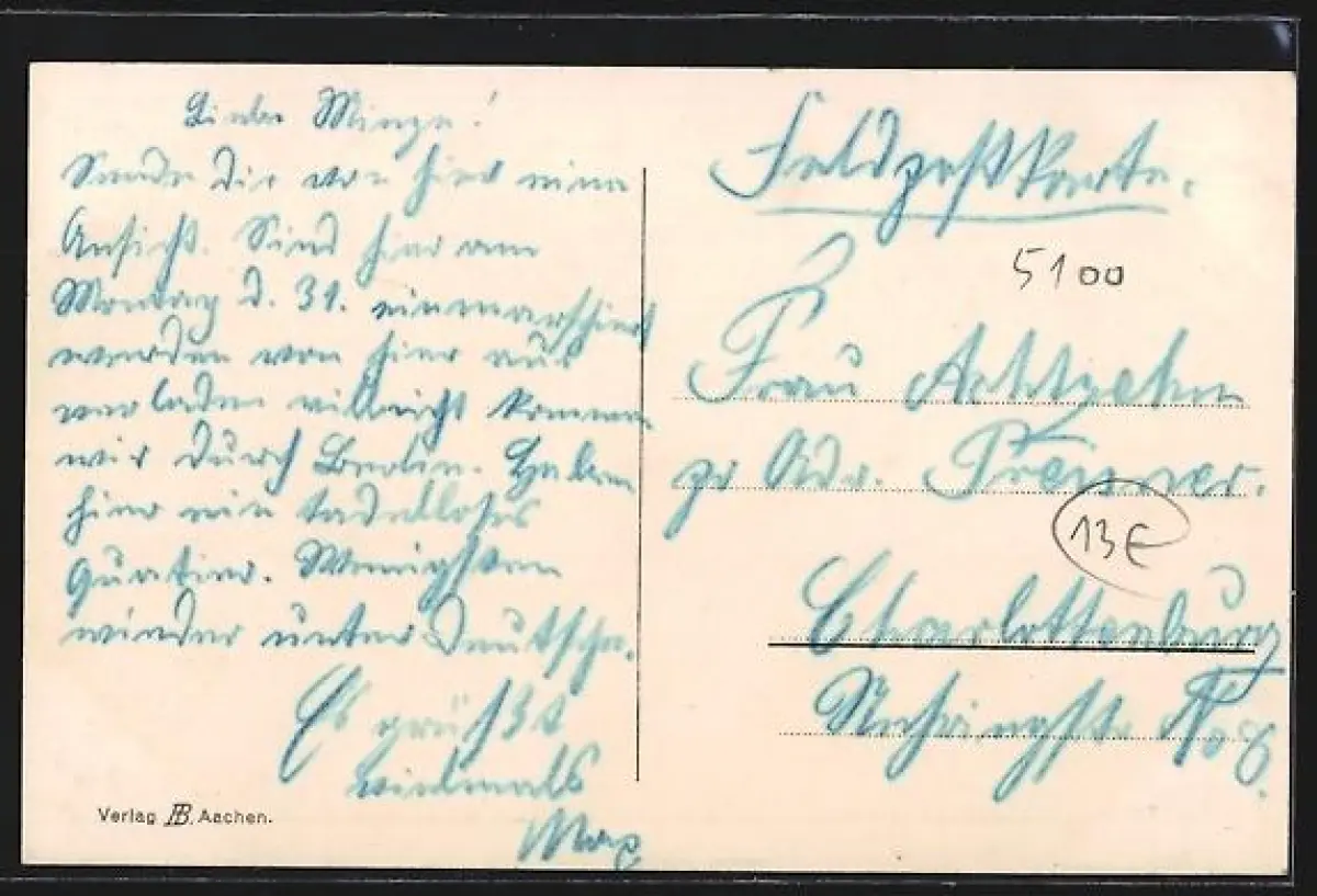 Personenbezogene Daten auf der Rückseite der Karte wurden durch blauen Textmarker unkenntlich gemacht. Die blauen Stellen sind auf die Vorderseite durchgeweicht und wirken sich negativ auf das Postkartenfoto aus