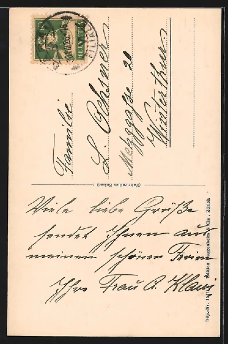 Personenbezogene Daten auf der Rückseite der Karte wurden durch blauen Textmarker unkenntlich gemacht. Die blauen Stellen sind auf die Vorderseite durchgeweicht und wirken sich negativ auf das Postkartenfoto aus