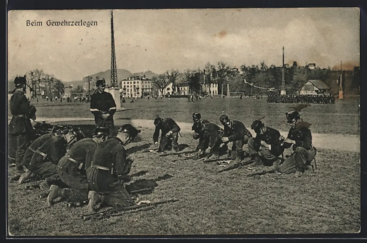 AK Aarau, Soldaten in Uniform beim Gewehrzerlegen