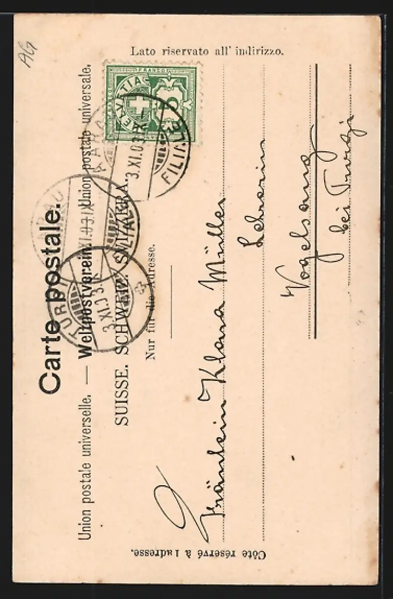 Personenbezogene Daten auf der Rückseite der Karte wurden durch blauen Textmarker unkenntlich gemacht. Die blauen Stellen sind auf die Vorderseite durchgeweicht und wirken sich negativ auf das Postkartenfoto aus