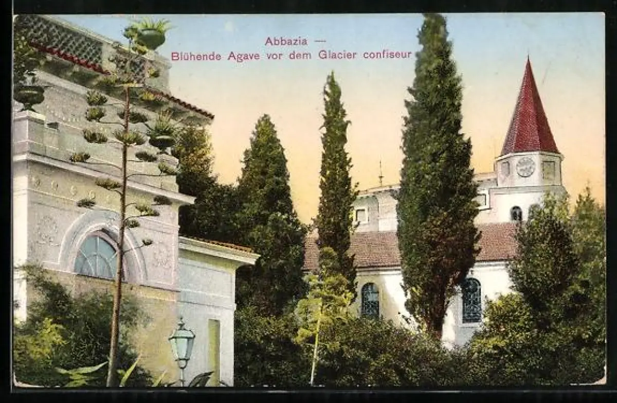 AK Abbazia, Blühende Agave vor dem Glacier confiseur