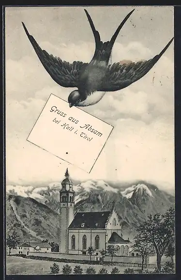 AK Absam bei Hall, Schwalbe mit Brief über der Kirche