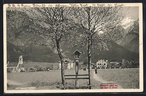 AK Absam bei Hall i. Tirol, Ortspanorama mit Bildstock
