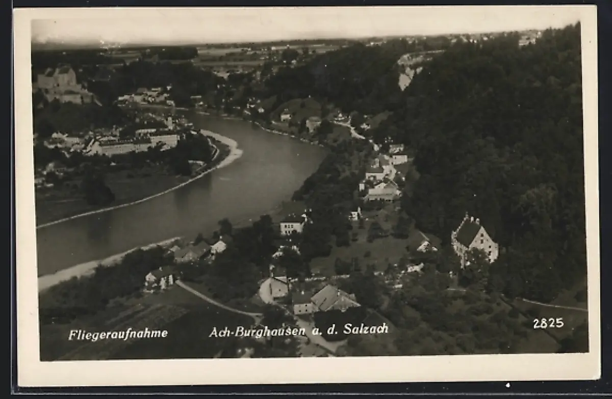 AK Ach-Burghausen a. d. Salzach, Teilansicht, Fliegeraufnahme