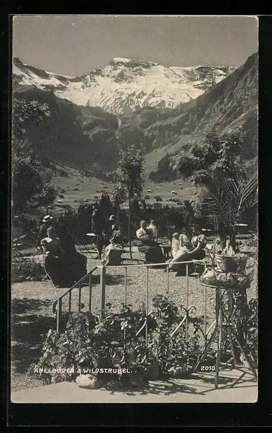 AK Adelboden, Gäste im Garten, Blick zum Wildstrubel