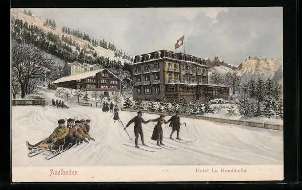AK Adelboden, Hotel La Rondinella mit Skifahrern