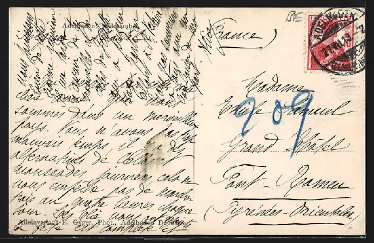 Personenbezogene Daten auf der Rückseite der Karte wurden durch blauen Textmarker unkenntlich gemacht. Die blauen Stellen sind auf die Vorderseite durchgeweicht und wirken sich negativ auf das Postkartenfoto aus