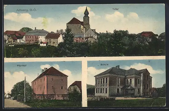 AK Adlwang, Pfarrhof, Schule, Teilansicht mit Kirche