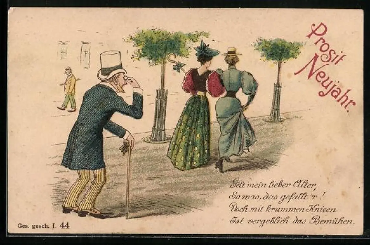 AK Älterer Mann mit Zylinder schaut zwei Damen hinterher, Erotik