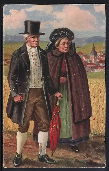 AK Älteres Paar in thüringischer Tracht beim Kirchgang