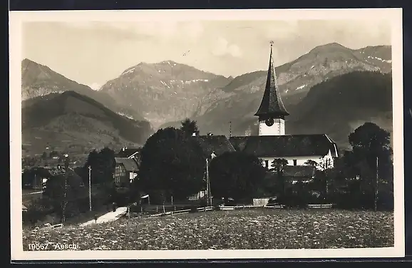 AK Aeschi, Teilansicht mit Kirche und Alpenpanorama