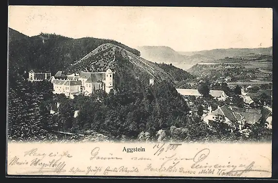 AK Aggstein, Ortsansicht mit Bergpanorama aus der Vogelschau