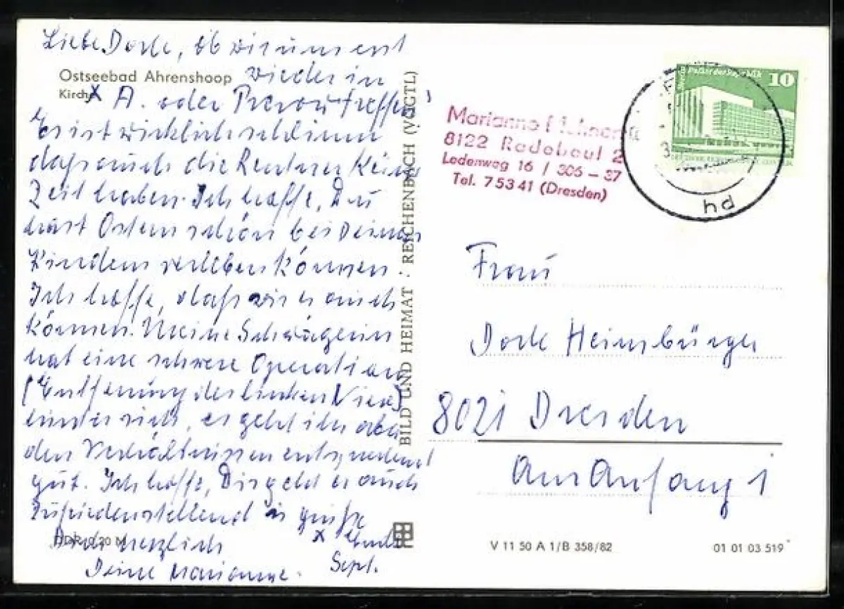 Personenbezogene Daten auf der Rückseite der Karte wurden durch blauen Textmarker unkenntlich gemacht. Die blauen Stellen sind auf die Vorderseite durchgeweicht und wirken sich negativ auf das Postkartenfoto aus