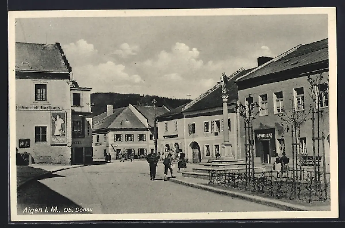 AK Aigen i. M., Strassenpartie mit Gasthaus Helmreich, Apotheke und Denkmal