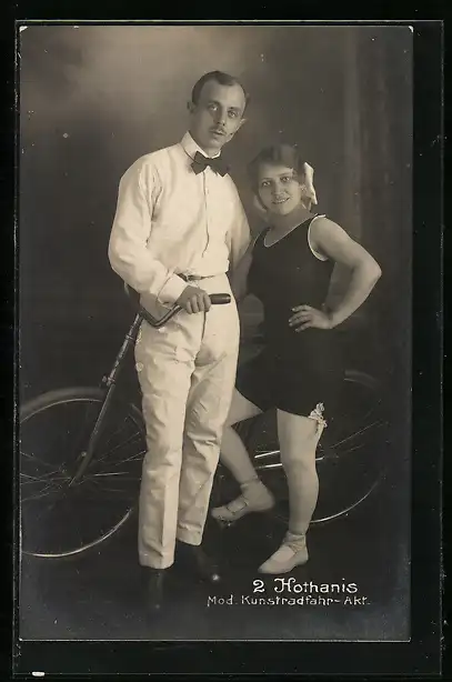 AK Akrobaten 2 Hothanis, Mod. Kunstradfahr-Akt, Portrait mit Fahrrad