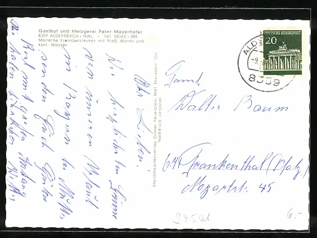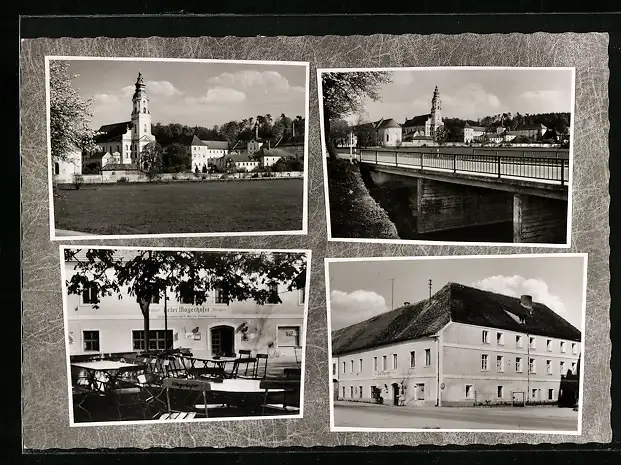 AK Aldersbach /Ndb., Gasthof und Metzgerei Peter Mayerhofer, Ortsansicht mit der Kirche