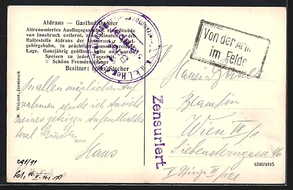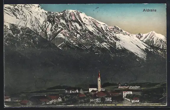 AK Aldrans, Ortsansicht mit Gasthof Stecher und dem Gebirge