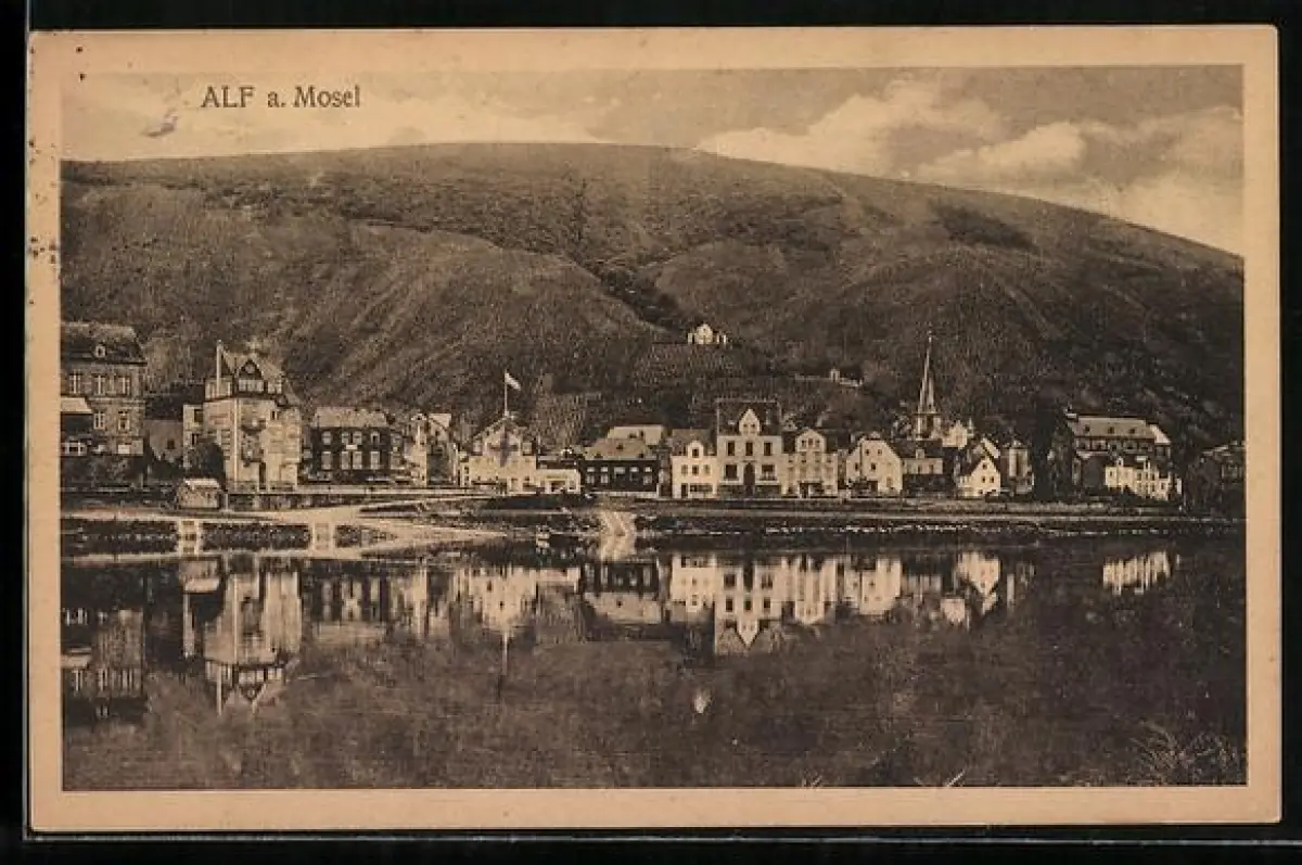 AK Alf a. Mosel, Ortsansicht mit Moselufer und Weinbergen