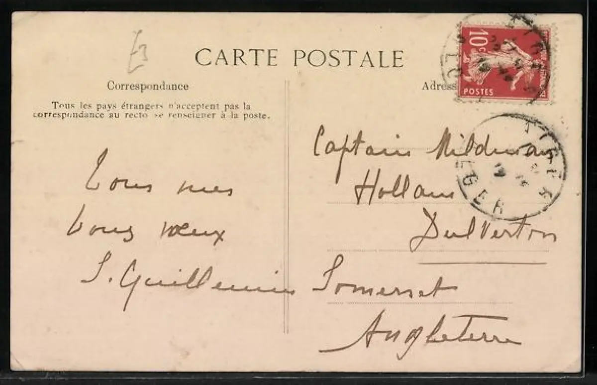 Personenbezogene Daten auf der Rückseite der Karte wurden durch blauen Textmarker unkenntlich gemacht. Die blauen Stellen sind auf die Vorderseite durchgeweicht und wirken sich negativ auf das Postkartenfoto aus