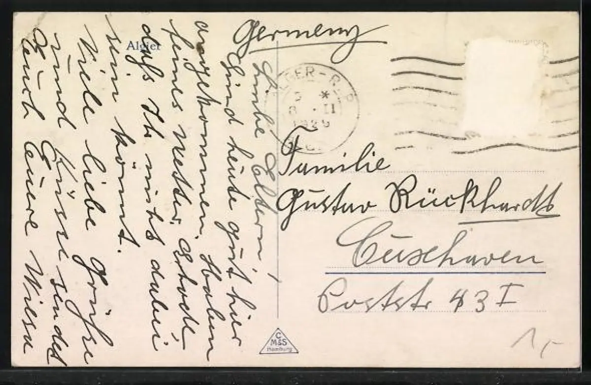alte Ansichtskarte, gelaufen 1929, Briefmarke entfernt, rückseitig Oberflächenschaden, Eckknicke oben, guter Zustand