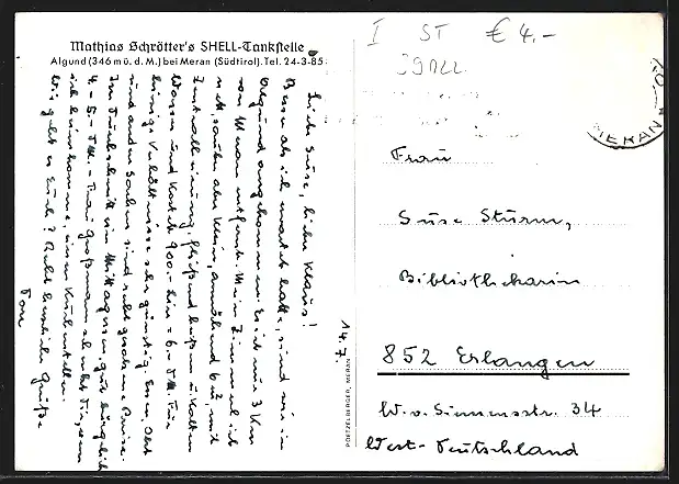 AK Algund bei Meran, Schrötters Shell-Tankstelle mit Fremdenzimmern - Gebäudeansicht mit Strasse, Innenansicht