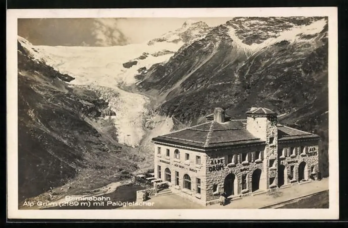 AK Alp Grüm, Bahnhof der Berninabahn mit Palügletscher