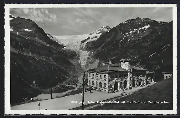 AK Alp Grüm, Bahnhofbüffet mit Piz Palü & Palugletscher
