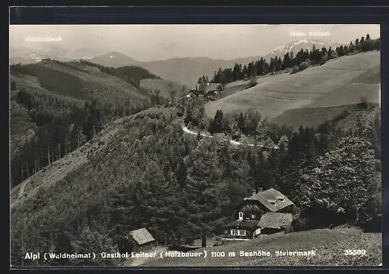 AK Alpl /Steiermark, Gasthof Leitner mit Hochschwab und Hoher Veitsch