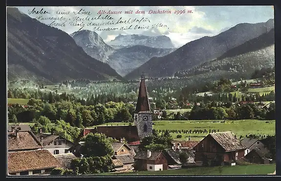AK Alt-Aussee, Teilansicht mit Kirche und Blick zum Dachstein