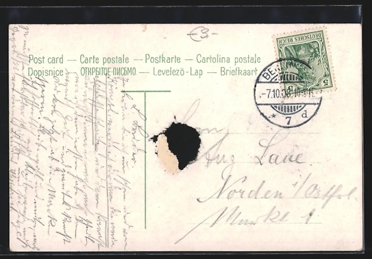 gelaufen 1908, rückseitig Klebe- und Papierreste, rückseitig Oberflächenschaden, guter Zustand