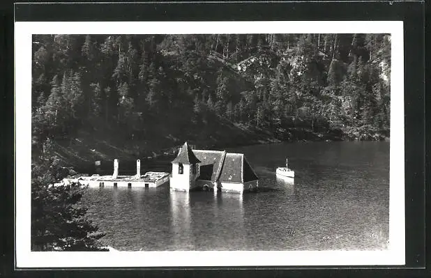 AK Alt Bitov, Überflutete Kirche mit Boot