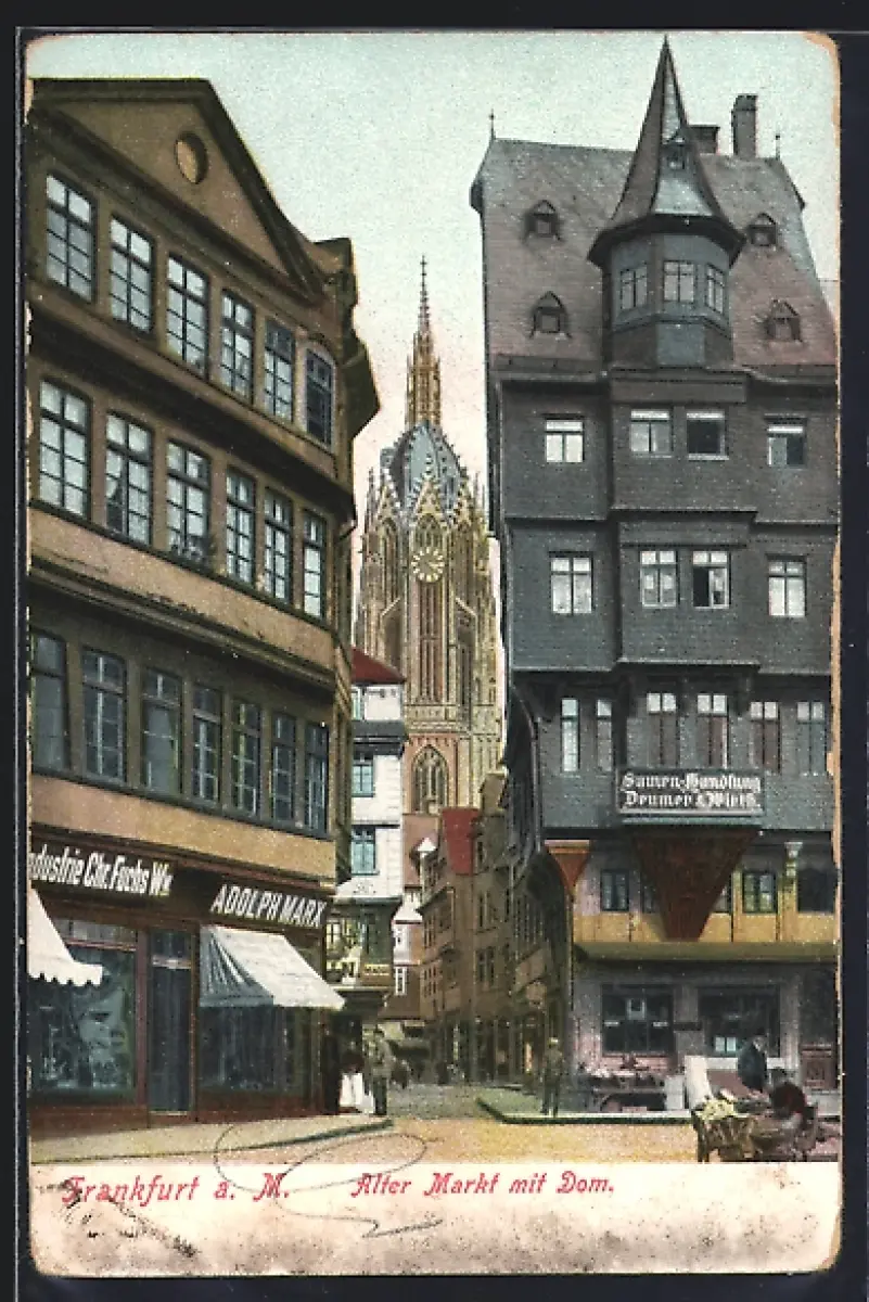 AK Alt-Frankfurt, Alter Markt mit Dom, Geschäft von Adolph Marx