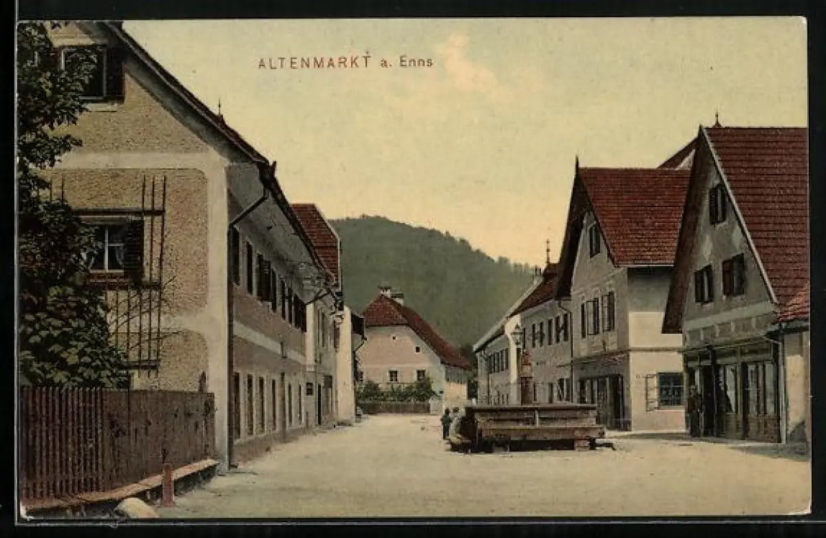 AK Altenmarkt a. Enns, Ortspartie mit Häusern und Brunnen