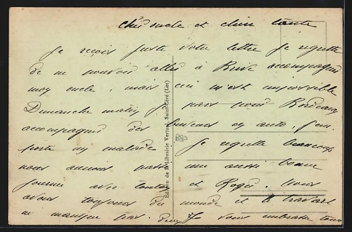 Personenbezogene Daten auf der Rückseite der Karte wurden durch blauen Textmarker unkenntlich gemacht. Die blauen Stellen sind auf die Vorderseite durchgeweicht und wirken sich negativ auf das Postkartenfoto aus