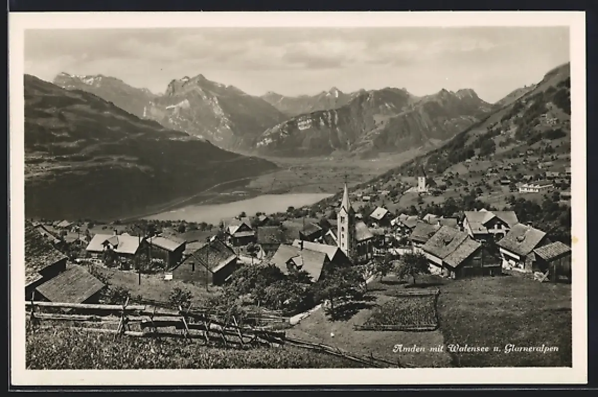 AK Amden, Ortsansicht mit Walensee und Glarneralpen