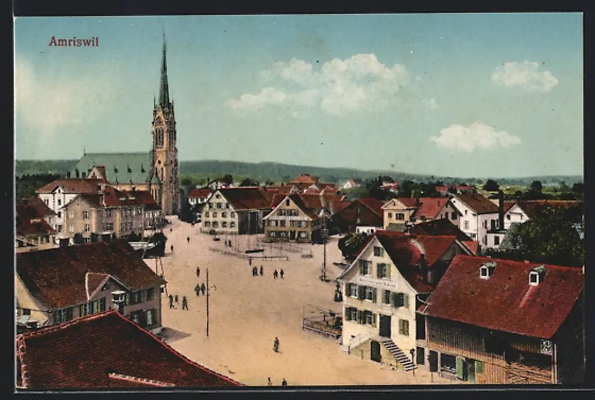 AK Amriswil, Kirche und Geschäfte am Marktplatz