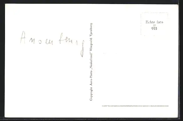 Personenbezogene Daten auf der Rückseite der Karte wurden durch blauen Textmarker unkenntlich gemacht. Die blauen Stellen sind auf die Vorderseite durchgeweicht und wirken sich negativ auf das Postkartenfoto aus