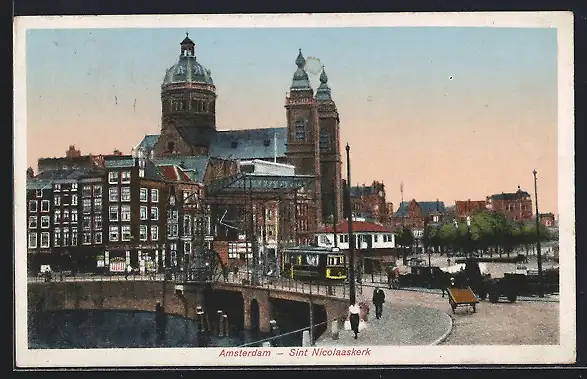 AK Amsterdam, Sint Nicolaaskerk, Strassenbahn