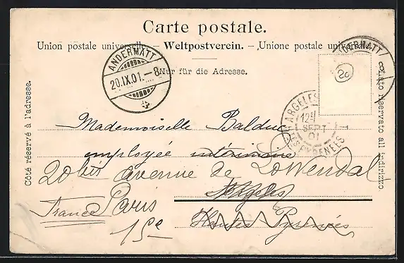 gelaufen 1901, Briefmarke entfernt, rückseitig Oberflächenschaden, Eckknick re. unten, guter Zustand