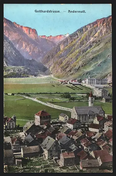 AK Andermatt, Ortsansicht von oben mit Gotthardstrasse