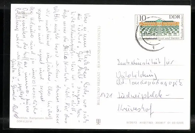 Personenbezogene Daten auf der Rückseite der Karte wurden durch blauen Textmarker unkenntlich gemacht. Die blauen Stellen sind auf die Vorderseite durchgeweicht und wirken sich negativ auf das Postkartenfoto aus