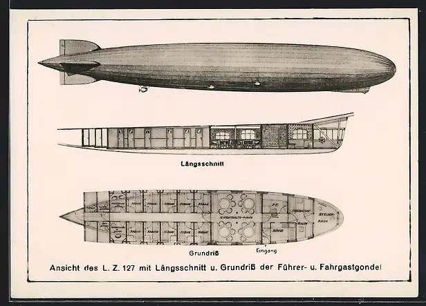 AK Ansicht des LZ 127 Graf Zeppelin mit Längsschnitt und Grundriss der Führer- u. Fahrgastgondel