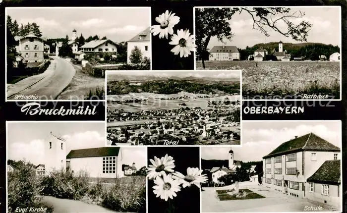 AK / Ansichtskarte 73833150 Bruckmuehl_Inn Ortsmotiv Rathaus Ev Kirche Schule Panorama Bruckmuehl Inn