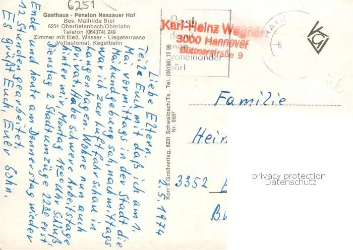 73852514 Obertiefenbach_Taunus Gasthaus Pension Nassauer Hof Gaststube Hirsch Seeweiher Obertiefenbach Taunus postalisch gelaufen 1974 Erhaltung siehe scans [WerneD78] [WernPID7 ]