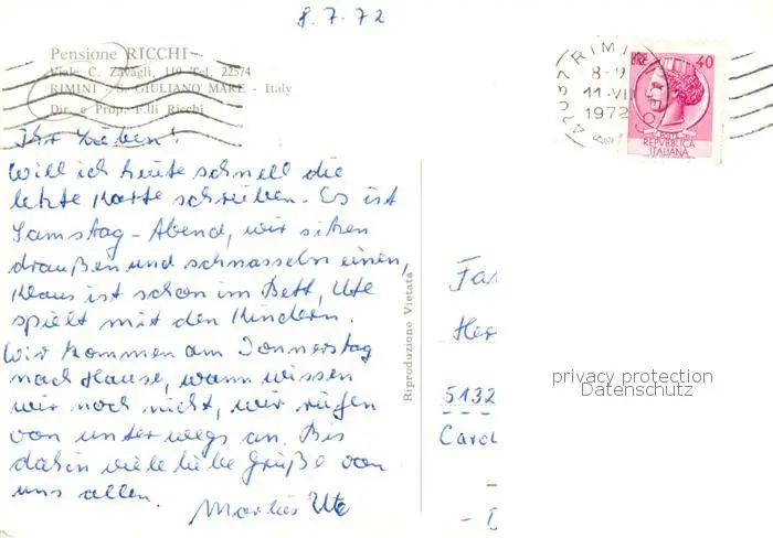 73862269 Rimini_IT Pensione Ricchi postalisch gelaufen 1972 Erhaltung siehe scans [FriedD77] [Frierer ]