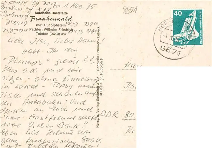 73940568 Rudolphstein Autobahn-Raststaette Frankenwald postalisch gelaufen 1975 Erhaltung siehe scans [FriedD77] [Frierer ]