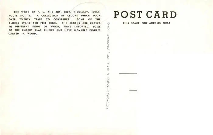 73948657 Ridgeway_Iowa_USA Bily Brothers Clocks postalisch nicht gelaufen 1921-1965 Erhaltung siehe scans [WerneD78] [WernPID7 ]