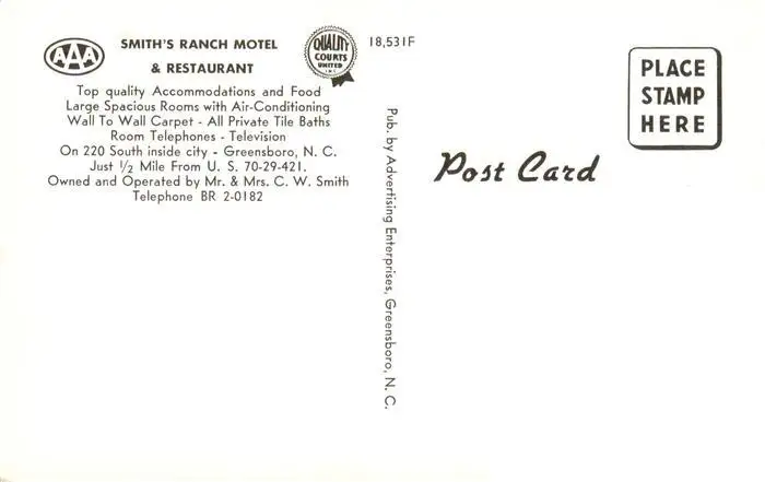 73948685 Greensboro_North_Carolina_USA Smiths Ranch Motel and Restaurant postalisch nicht gelaufen nach 1965 Erhaltung siehe scans [WerneD78] [WernPID7 ]