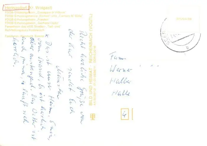 73961633 Heringsdorf__Ostseebad_Usedom FDGB Erholungsheime Guiseppe di Vittorio Einheit und Carmara Frieden Gerhard Opitz Ferienheim Rohrleitungsbau Rodewisch postalisch nicht gelaufen nach 1965 Erhaltung siehe scans [WerneD78] [WernPID7 ]