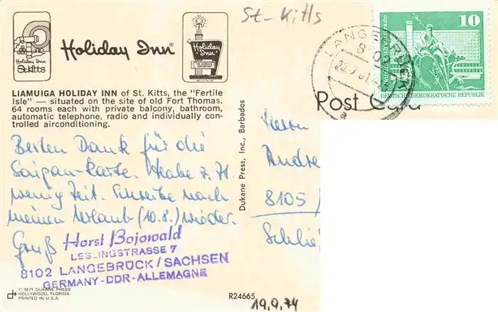73969659 St_Kitts_and_Nevis_West_Indies Liamuiga Holiday Inn Illustation postalisch gelaufen 1974 Erhaltung siehe scans [FriedD77] [Frierer ]